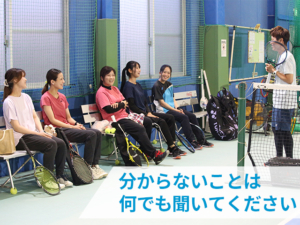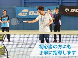初心者の方は、ボールやラケットに慣れるところから。テニス経験や体力に合わせて楽しくレッスンします。分からないことがあれば、何でも質問してください!