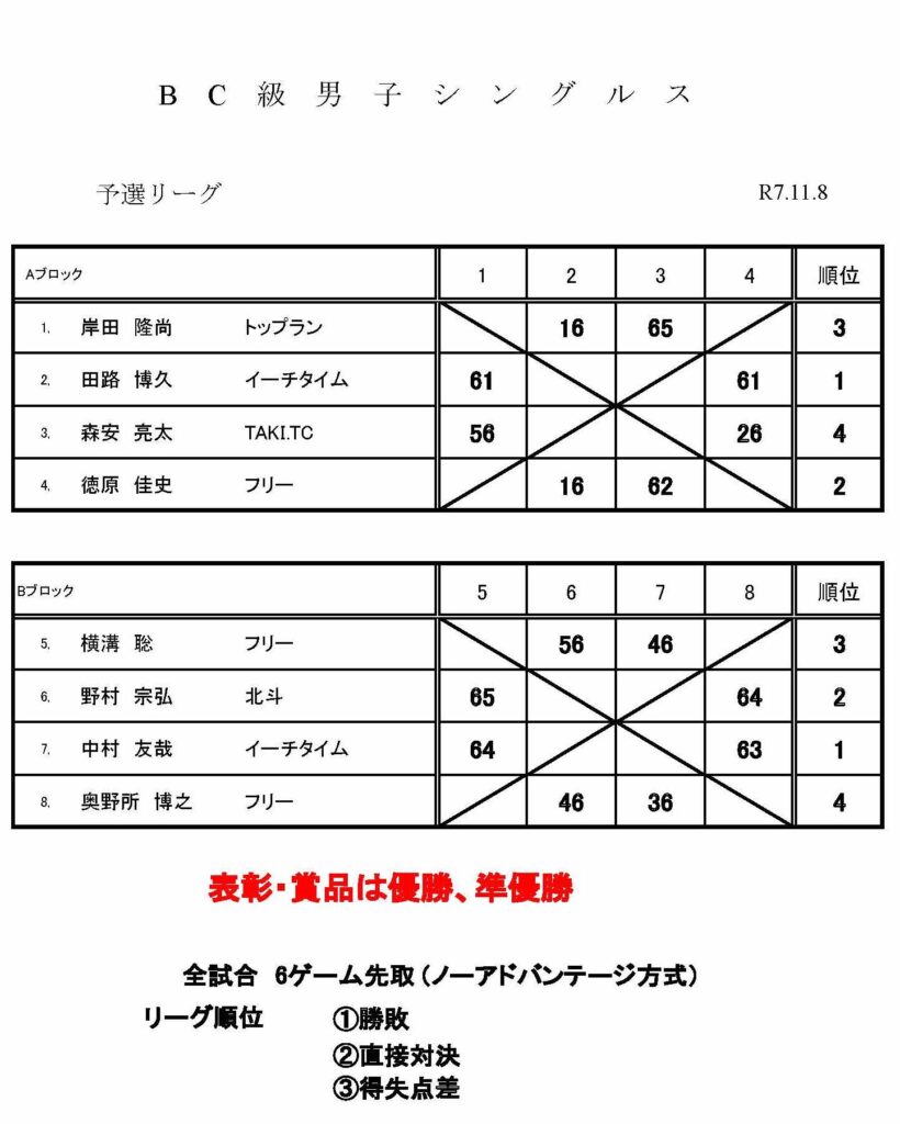 目次11/8 BC級男子シングルス 2025年11月8日(土)、石守校にて、「BC級男子シングルス大会」を開催しました。 スクロールできます 大会結果 【加古川オープンサーキット】 11/3 CD級男子シングルス大会結果 カテゴリー イベント お知らせ ショップ スタッフ紹介 テニス上達の秘訣 トレセン 今月のトップラン 大会結果 関連記事 【加古川オープンサーキット】 11/3 CD級男子シングルス大会結果 2025年11月5日 【加古川オープンサーキット】 10/11 初心級男子シングルス大会結果 2025年11月5日 10/30【第40回姫路書写レディーストーナメント】 大会結果 2025年11月5日 【姫路書写メンズシングルス】10/18 大会結果 2025年10月20日 【加古川オープンサーキット】9/28 CD級男子シングルス大会結果 2025年9月29日 【加古川オープンサーキット】9/20 BC級男子シングルス大会結果 2025年9月24日 【加古川オープンサーキット】9/15 CD級男子シングルス大会結果 2025年9月24日 【加古川オープンサーキット】8/23 BC級男子シングルス大会結果 2025年8月27日