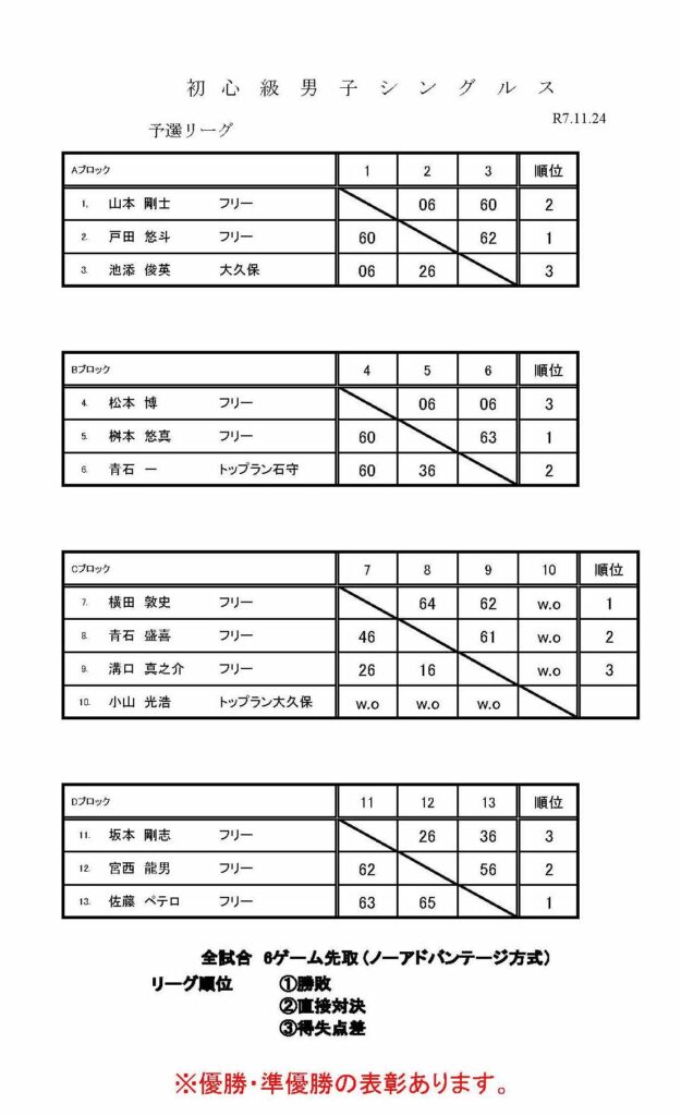 目次11/24 初心級男子シングルス 2025年11月24日(月)、石守校にて、「初心級女子ダブルス大会」を開催しました。 スクロールできます 優勝 青石 盛喜 準優勝 桝本 悠真 大会結果 【加古川オープンサーキット】 11/21 初心級女子ダブルス大会結果 カテゴリー イベント お知らせ ショップ スタッフ紹介 テニス上達の秘訣 トレセン 今月のトップラン 大会結果 関連記事 【加古川オープンサーキット】 11/21 初心級女子ダブルス大会結果 2025年11月26日 【加古川オープンサーキット】 11/8 BC級男子シングルス大会結果 2025年11月13日 【加古川オープンサーキット】 11/3 CD級男子シングルス大会結果 2025年11月5日 【加古川オープンサーキット】 10/11 初心級男子シングルス大会結果 2025年11月5日 10/30【第40回姫路書写レディーストーナメント】 大会結果 2025年11月5日 【姫路書写メンズシングルス】10/18 大会結果 2025年10月20日 【加古川オープンサーキット】9/28 CD級男子シングルス大会結果 2025年9月29日 【加古川オープンサーキット】9/20 BC級男子シングルス大会結果 2025年9月24日