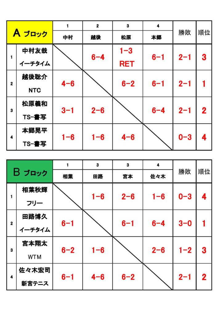 目次第3回姫路書写メンズシングルストーナメント 2026年2月14日(土)、書写校にて、「第3回姫路書写メンズシングルストーナメント大会」を開催しました。 スクロールできます 優勝 田路 博久(イーチタイム) 準優勝 新頭 一輝(日本製鉄) 大会結果 【加古川オープンサーキット】 1/25 CD級男子シングルス大会結果 カテゴリー イベント お知らせ ショップ スタッフ紹介 テニス上達の秘訣 トレセン 今月のトップラン 大会結果 関連記事 【加古川オープンサーキット】 1/25 CD級男子シングルス大会結果 2026年2月16日 【加古川オープンサーキット】 1/12 オープン男子ダブルス大会結果 2026年2月16日 【加古川オープンサーキット】 2/11 CD男子シングルス大会結果 2026年2月13日 1/10【第9回姫路書オープンジュニアテニス選手権(女子の部)】 大会結果 2026年1月14日 【加古川オープンサーキット】 1/10 CD男子シングルス大会結果 2026年1月14日 1/10【第9回姫路書オープンジュニアテニス選手権(男子の部)】 大会結果 2026年1月12日 12/27【第2回姫路書写メンズシングルストーナメント】 大会結果 2026年1月12日 12/13【第7回姫路書写アクティブシニアトーナメント】 大会結果 2025年12月17日