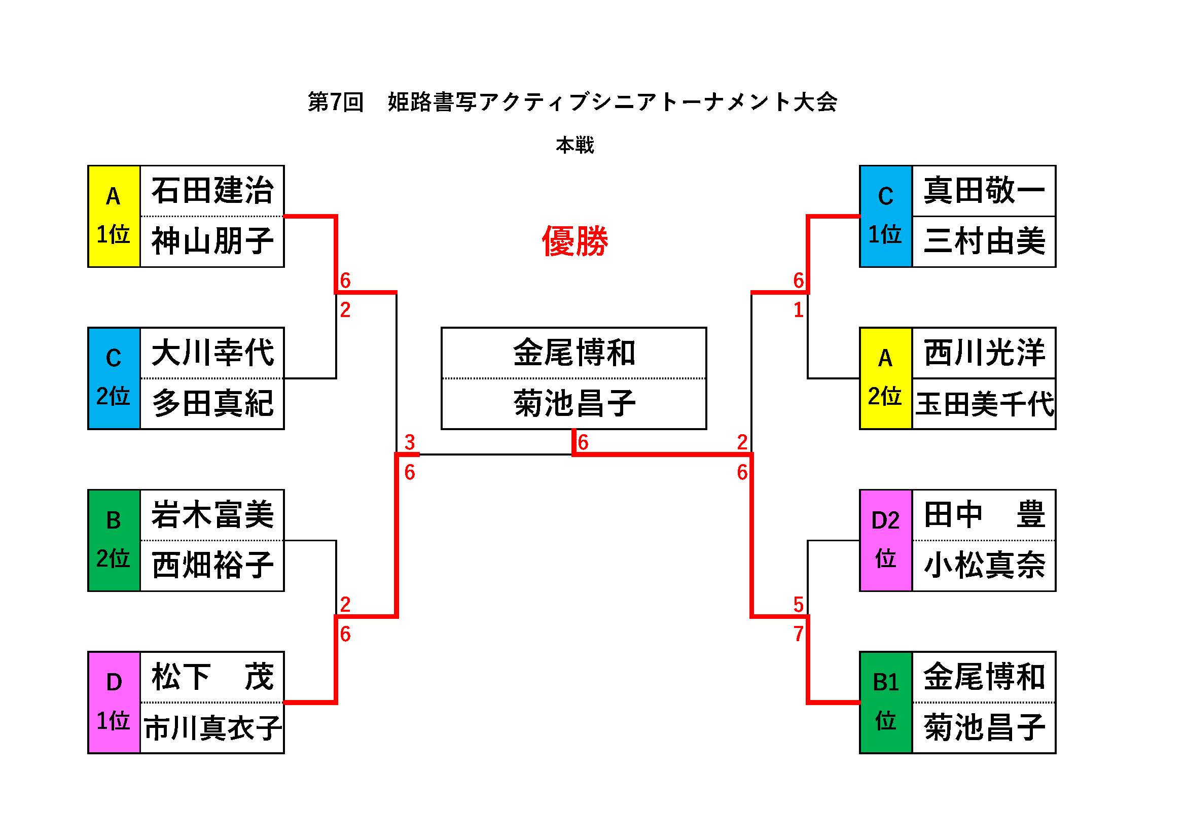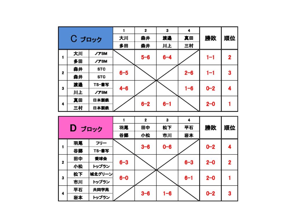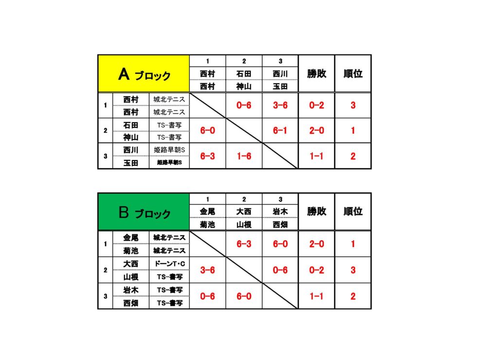 目次第7回姫路書写アクティブシニアトーナメント 2025年12月13日(土)、書写校にて、「第7回姫路書写アクティブシニアトーナメント大会」を開催しました。 スクロールできます 優勝 金尾・菊池(城北テニス) 準優勝 松下・市川(城北テニス・トップラン) 大会結果 【加古川オープンサーキット】 12/6 BC男子シングルス大会結果 カテゴリー イベント お知らせ ショップ スタッフ紹介 テニス上達の秘訣 トレセン 今月のトップラン 大会結果 関連記事 【加古川オープンサーキット】 12/6 BC男子シングルス大会結果 2025年12月10日 11/29【第2回姫路書写メンズトーナメント】 大会結果 2025年12月3日 【国際大会UTR】2025年11月24日〜30日 男女シングルス大会結果 2025年12月1日 【加古川オープンサーキット】 11/24 初心級男子シングルス大会結果 2025年11月26日 【加古川オープンサーキット】 11/21 初心級女子ダブルス大会結果 2025年11月26日 【加古川オープンサーキット】 11/8 BC級男子シングルス大会結果 2025年11月13日 【加古川オープンサーキット】 11/3 CD級男子シングルス大会結果 2025年11月5日 【加古川オープンサーキット】 10/11 初心級男子シングルス大会結果 2025年11月5日